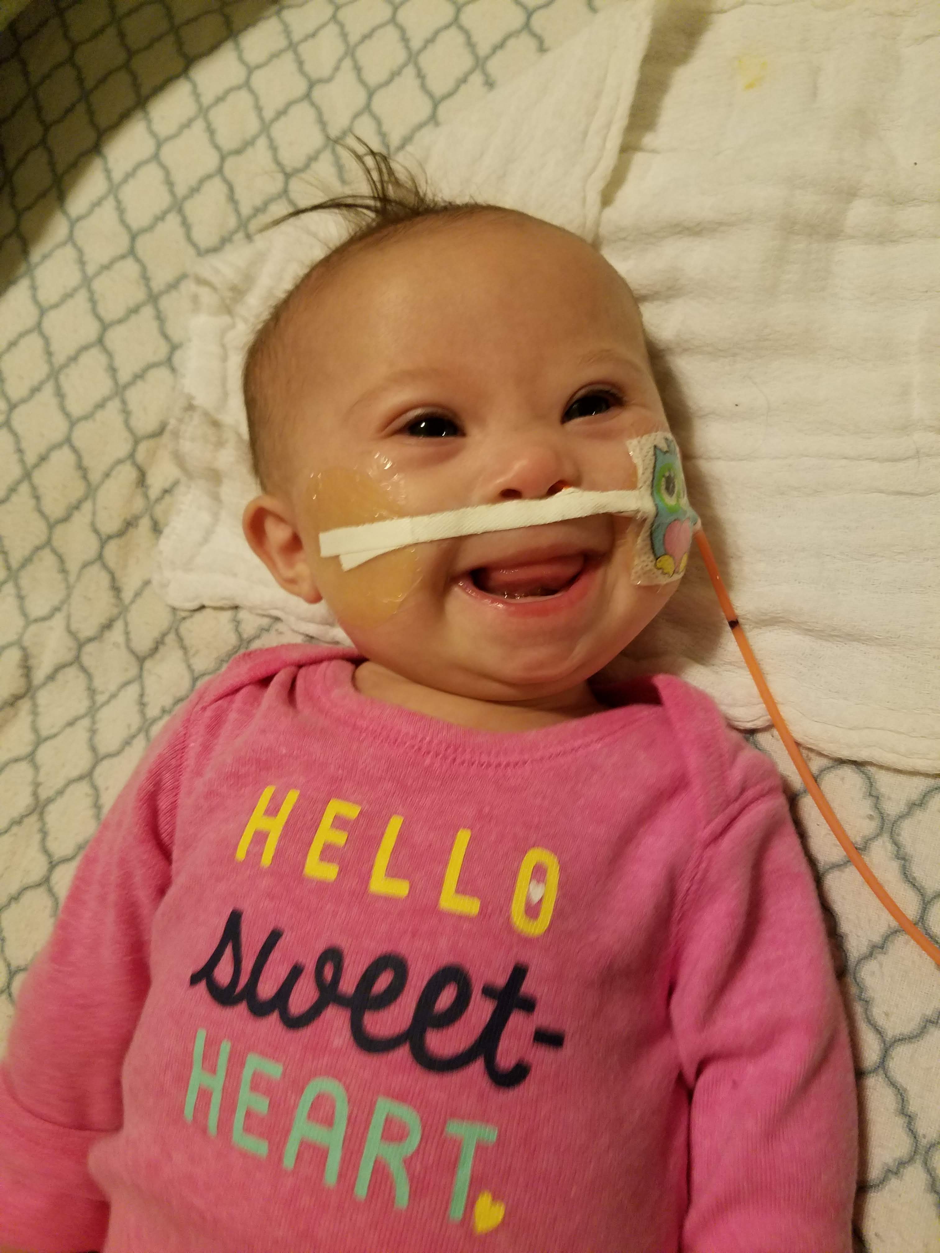 Then Ivy got sick. In an effort to ensure she did not have aspiration pneumonia, the doctor ordered a chest x-ray. It was a Friday afternoon and the doctor called with the results. It was not our normal pediatrician. She immediately told me that the x-ray was negative for pneumonia but it did find a diaphragmatic hernia. Then she said, “Don’t Google it, we’ll get in touch with you next week.” So naturally, I panicked! One of my new Ds mom friends was also a NICU nurse, so I immediately texted her. She said the reason the doctor told me not to Google it was that there are two types of diaphragmatic hernias. A hernia is a weakness or hole that should not exist in the middle of a muscle which allows organs or tissues to push through. The most common kind is caught during pregnancy occurs in the side and back of the diaphragm and involves a large portion of the abdominal organs up into the chest cavity, which impedes lung growth, and requires surgery immediately after birth. Ivy had the much more rare kind called a Morgagni diaphragmatic hernia which occurs in the front of the diaphragm so that only a portion of her intestines was protruding into her chest. It had not significantly impeded her lung growth which is why we didn’t know about it. Most likely, it was causing some of her reflux issues, and so it would need to be repaired.