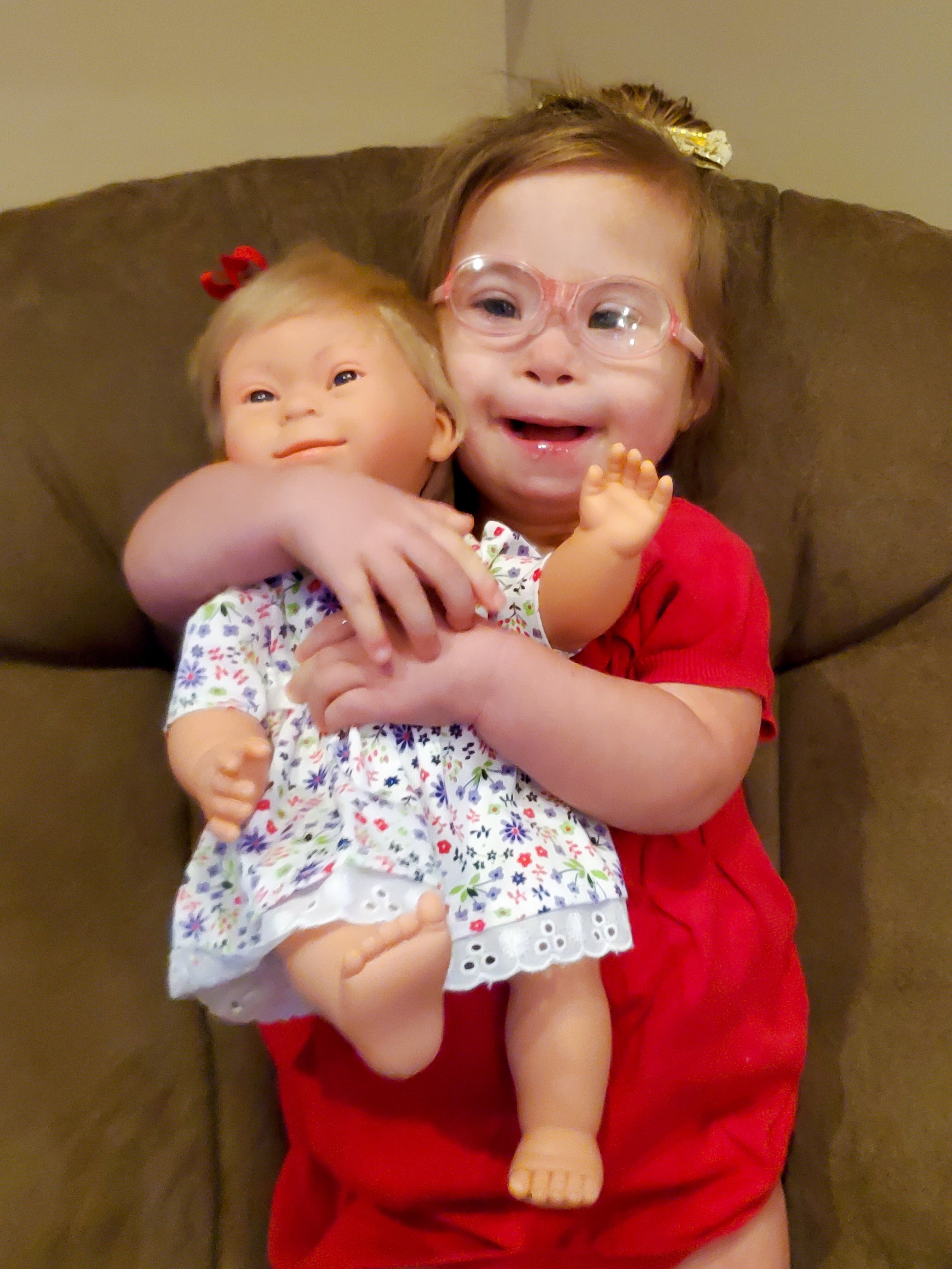 Look at these beautiful girls. Each one is represented by a doll that looks like them. Ivy has Down syndrome. Her doll looks just like her with almond shaped eyes and a button nose! Our friend Eliza has Spina Bifida. Her doll has forearm crutches (or ‘sticks’ as Eliza calls them) just like her! Our friend Stella has Spinal Muscular Atrophy. Her doll has a wheelchair just like her! Look at their faces. Pride at having a toy just like them. Imagine a typical child who had one of these dolls at home among their other dolls. Imagine how they might react to seeing a person with Down syndrome, or forearm crutches, or in a wheelchair. All of the sudden that person is just another person. Their differences have already been validated and explored by that child through play. That child will be much more likely to say ‘Hi’ and ask a name than point and stare! Representation matters!